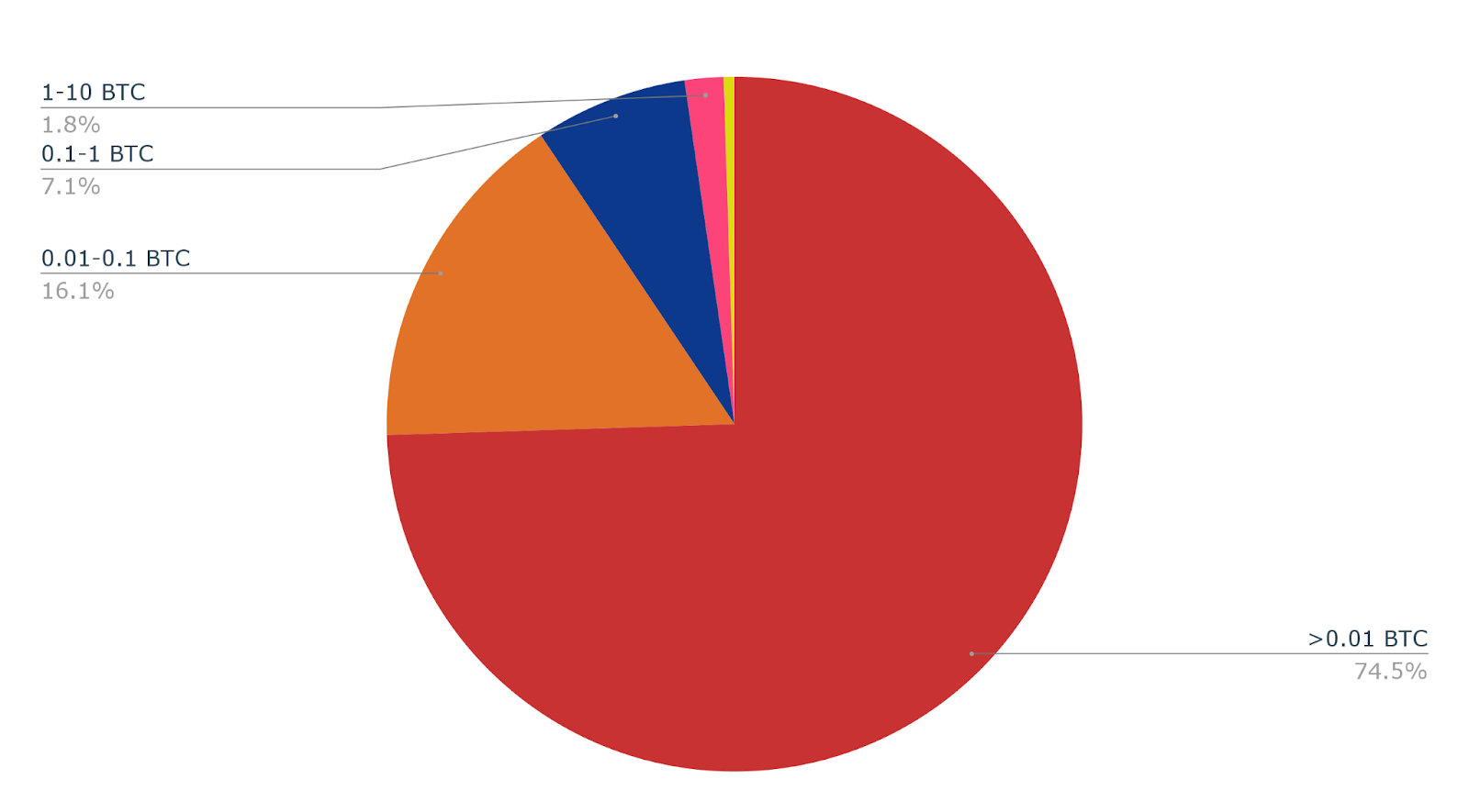 - Only 4 wallets own over 100,000 BTC each, together holding 3.23% of all coins.