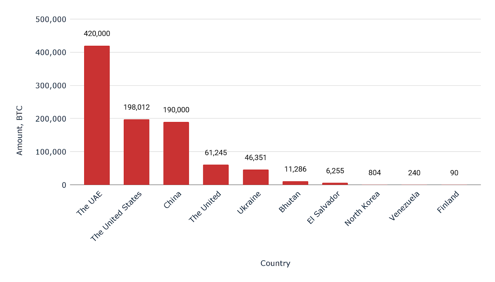 - The UAE leads with 420,000 BTC, showcasing its position as a major global hub for cryptocurrency adoption.