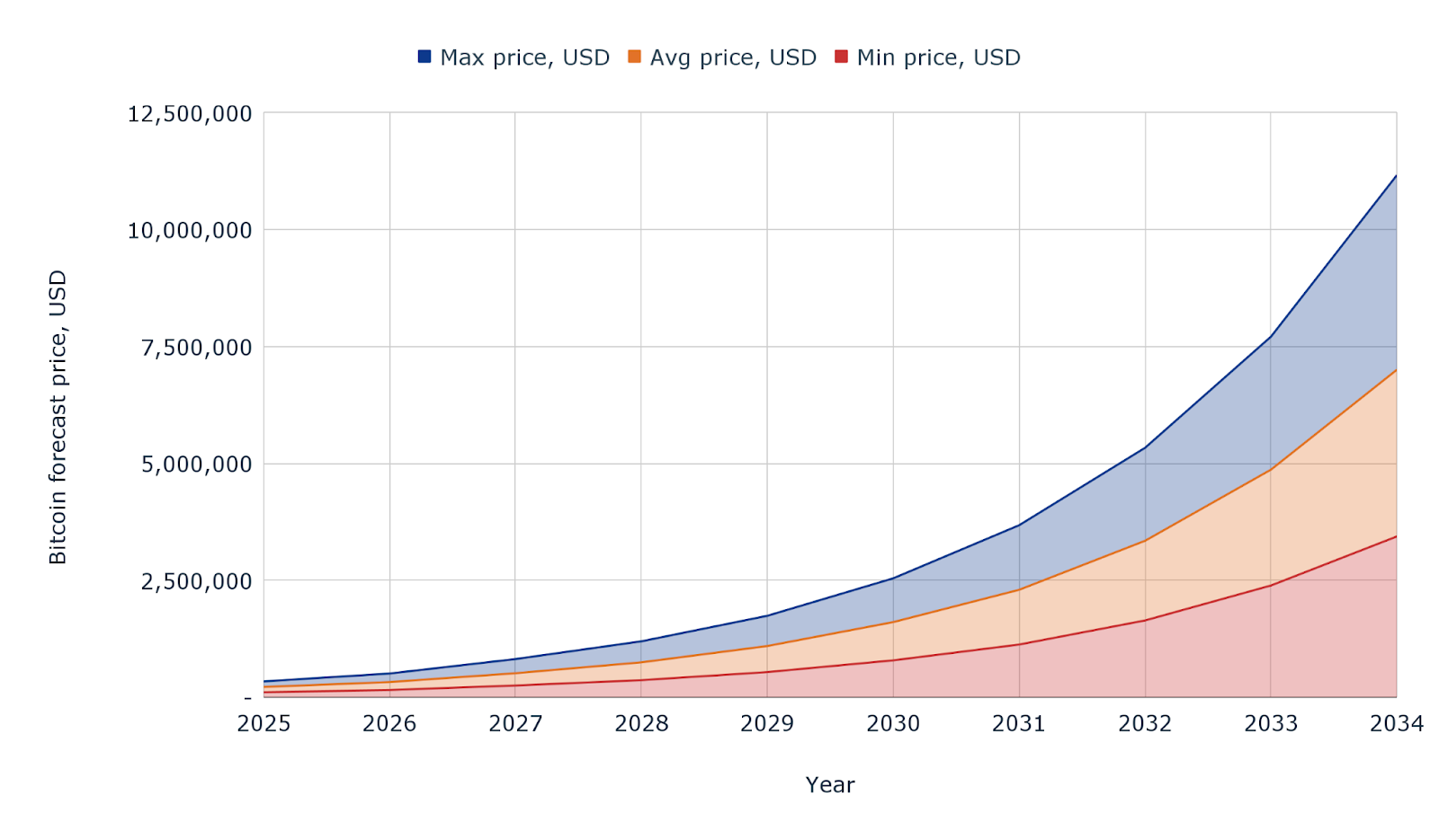 - In 2034, Bitcoin could average $3,565,109, with a possible high of $4,160,614.