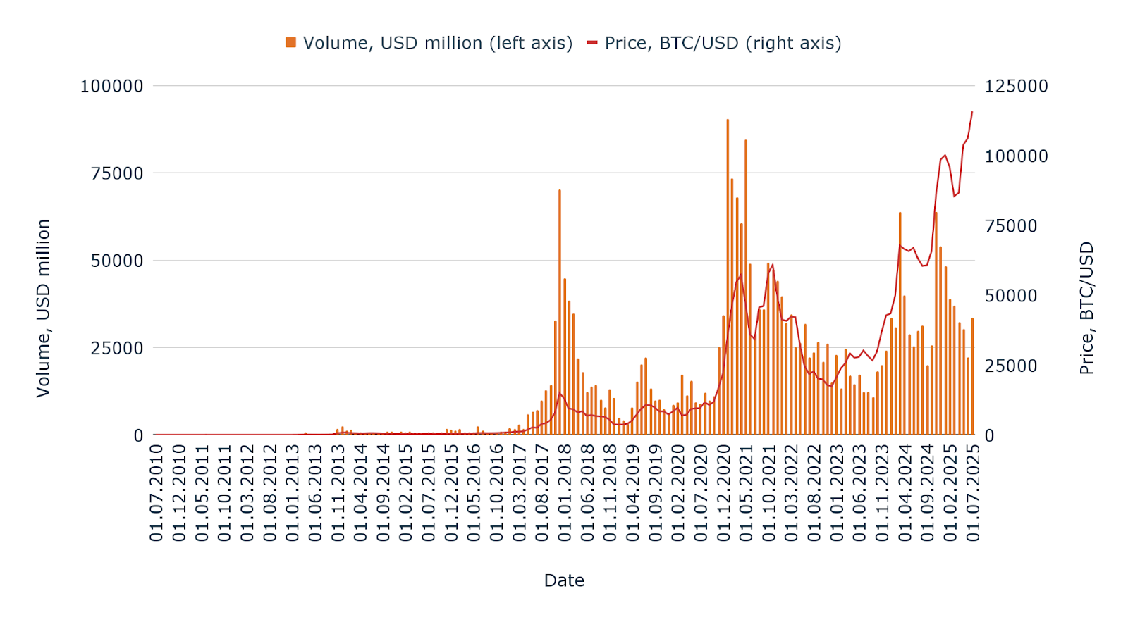 The combined analysis of Bitcoin’s price and trading volume in USD highlights the evolving market activity and liquidity dynamics from 2010 to 2025.
