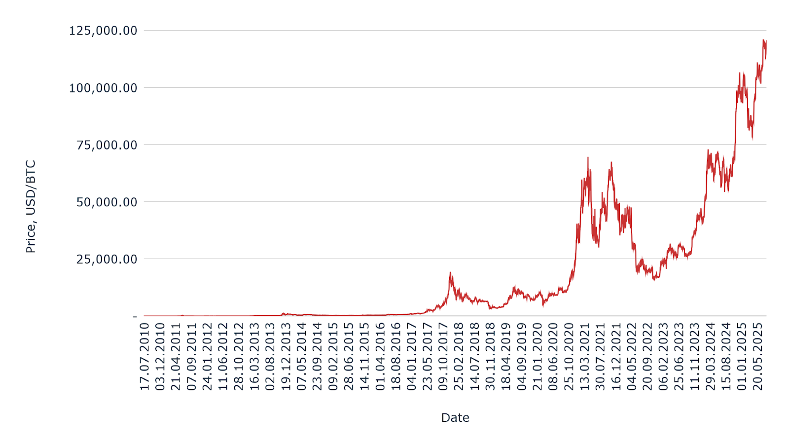 - Bitcoin rose from just $0.06 in mid-2010 to over $115,700 by July 2025, illustrating extreme long-term growth and volatility.